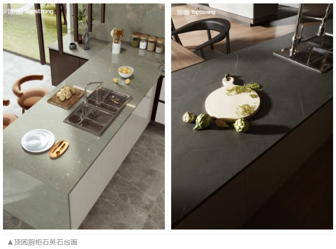 頂固廚柜采用食品級石英石臺面,可直接接觸食材,抗污耐刮、防火耐沖擊、花色選擇豐富且色澤穩定恒久。